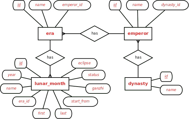The database contains four entities: dynasty, emperor, era and lunar_month.